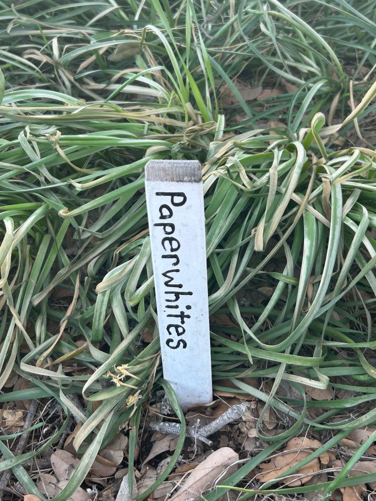 When I ran out of pots, I piled straw on top of the bulbs to completely cover the foliage, creating a natural trough for the local deer. That wasn’t one of my finer moments in the garden. In fact, the first day back after the freeze, I arrived at the studio to find a fattened young buck hanging out in my Crinum bed. He looked at me as if I had just interrupted something. Eventually, the deer realized that this was MY house and garden, and left the same way he came in…effortlessly hoping my fence. The young buck left some nice piles of poo-pellets in my pathway as a flex to show me who is really in control. Next Spring, he will definitely have the last laugh as I am pulling up all the weeds he left in my pathway.