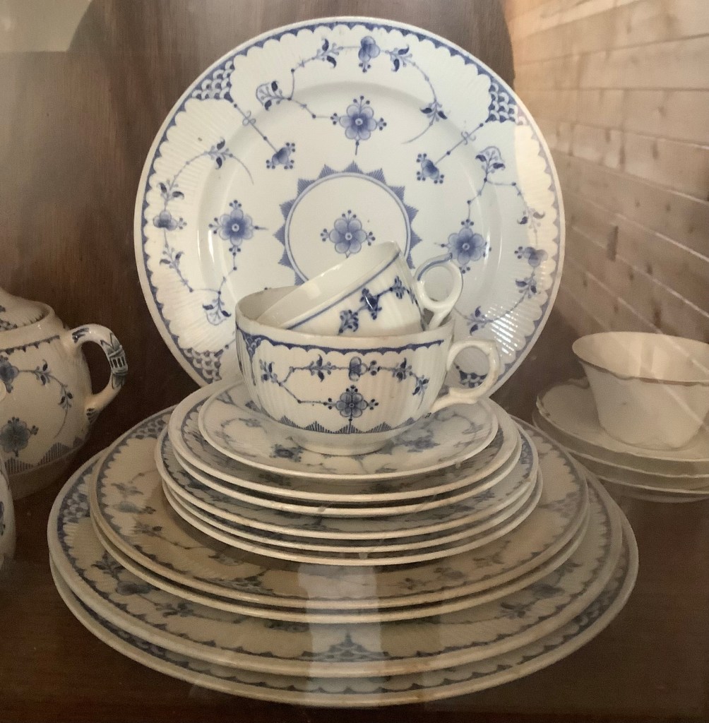 Finally, my Danish china Royal Copenhagen. I’m always on the lookout at thrift stores due to the expensive nature of this set. The tea cups were my Christensen side. Danish through and through. The teacup to the side was hand painted by my Great, Great Grandmother Simmons for my Great Grandmother Ethel. It was a wedding gift. How completely precious. Only one teacup remains. The memory lasts forever.