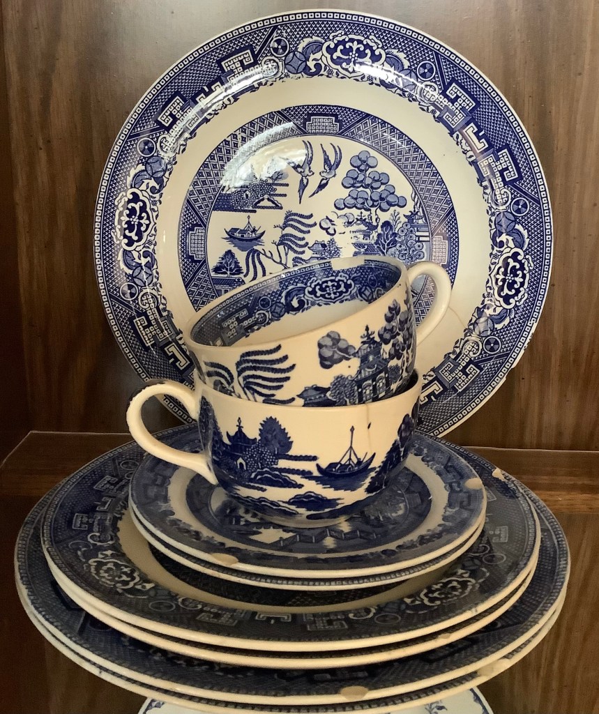 Many great memories are held within antique dishes. My Great-Grandmother had Blue Willow China at our cabin in Wyoming. Honestly, who has bone china from England at their cabin? As a child, I found this utterly divine and completely fascinating. When I got older, my dear Aunt Mary gave a few of the girl cousins some pieces of the cracked and chipped pieces that were no longer used. Treasures. It is so special to think of the countless relatives that have dined upon these dishes since the 1940’s.