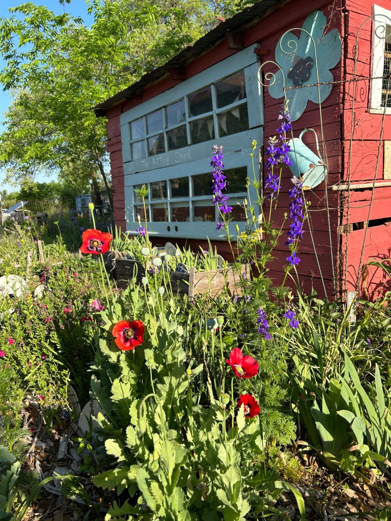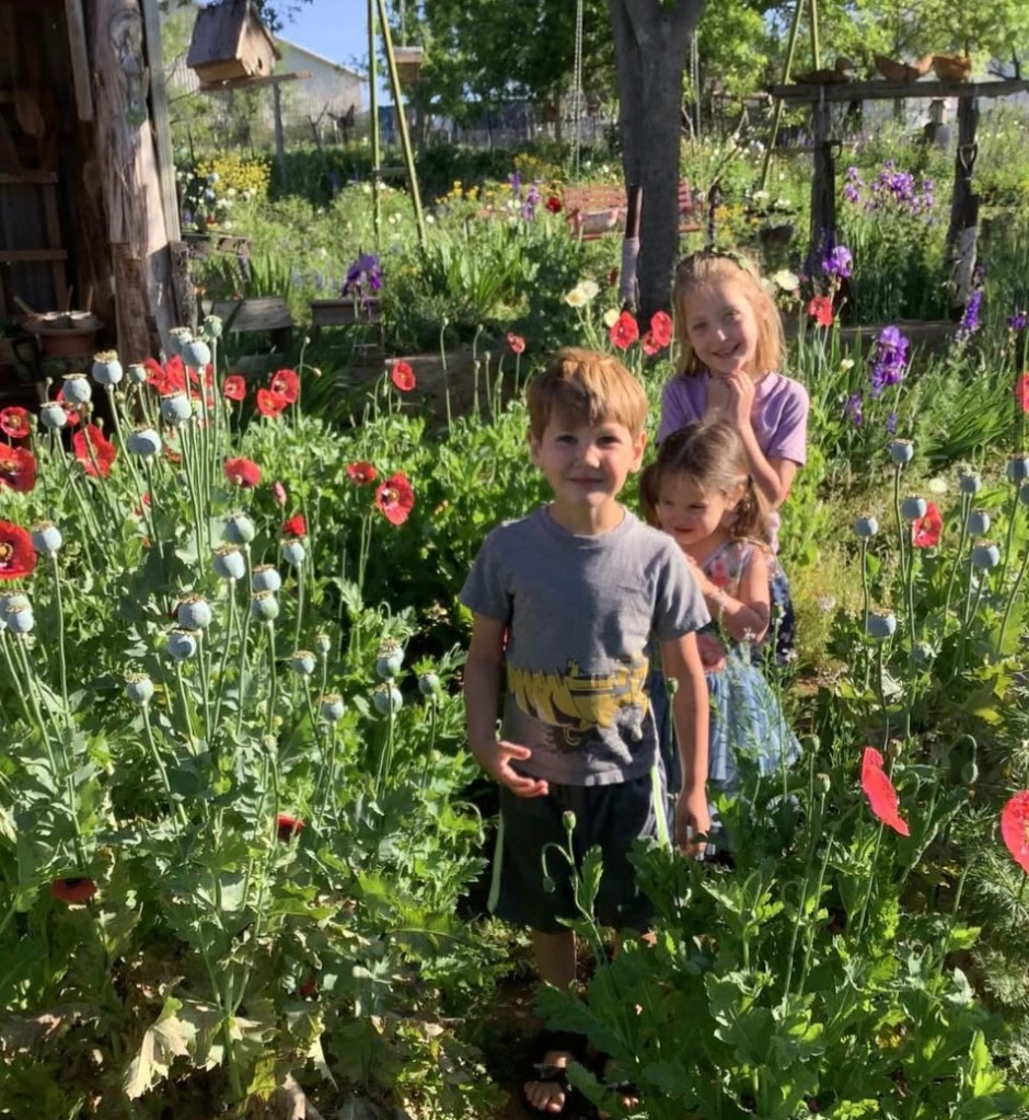 Red Poppies have grown in my garden since I first started my own gardens. My Dad didn’t grow poppies in Montana, so my love affair with poppies came about through gardening books about cottage style gardens (which, by the way, is like eye candy). I obtained my first packet of seeds from a former violin student’s parent in Dallas. She was German and had a very wild and free-range cottage garden. The cottage gardens were the envy of my heart. I loved the wild yarrow, eye-popping shades of poppies and larkspur and herbs all growing alongside her antique roses. I felt like I had stepped into a fairytale culture, somewhere *not* obsessed with the neat and tidy, extremely boring green lawn of our modern society. I was given my first start of red poppies and I’ve cherished them ever since.