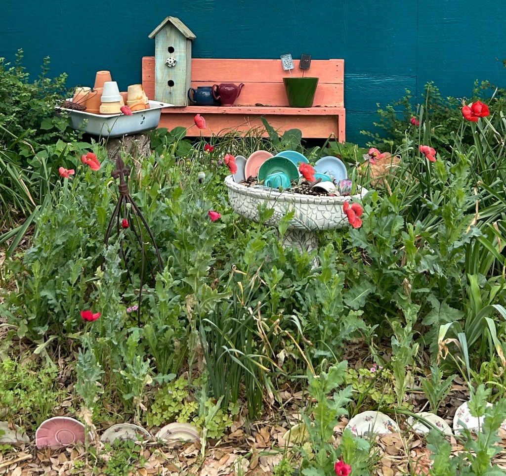 One thing to know about poppies, is that poppies like to ramble. There is no stopping the scattering of seeds once the poppy heads open up. Last year, my goal was to move the poppies into the wildflower area. I wanted to allow the front gardens to showcase the Spring bulbs. I worked hard at gently cutting the poppy heads, collecting and saving the seeds to scatter during Fall. For all you mathematically brilliant readers out there, guess how many poppies actually came up with all those great intentions?