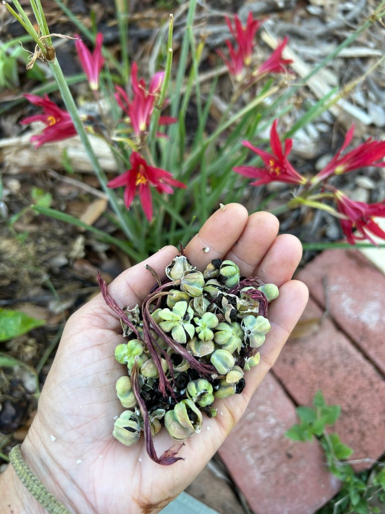 If you Google “do Oxblood Lilies go to seed?” most sights will say no. About 15 years ago, I had a hunch that mine did. I spotted way too many rogue Oxbloods throughout the yard. The relocation of lilies by Squirrels and small children were a distinct possibility, I decided to do a little science project. I did the whole “seed in paper moist paper towels” thing, and much to my joy, they sprouted. I did plant them as they grew and quickly lost track of my seed babies. Now I’m more savvy. I’m not knee-deep in violin concerts alongside peanut butter and honey child-rearing. My littles have all grown up, I have a somewhat of an empty nest and a lot of Oxblood Lily seeds to cultivate. The last 15 years, I have allowed nature do what it wants to do with the lily seeds. This year, I’m more intentional. I’m collecting the seeds and germinating them.