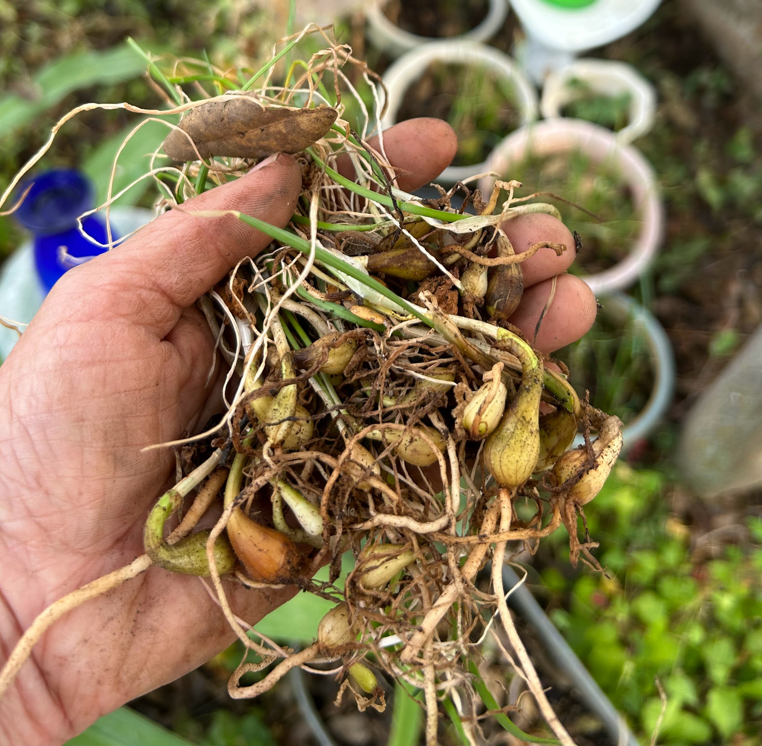 Anyhow, this dead-almost-dead drudgery carried on throughout the summer. Luckily, Heirloom Bulbs (even as seedpod babies) are way smarter than I am. Heirloom Bulbs are survivors, so about 400 plus little Crinum babies survived my ineptness. I am happy to report that I have planted about 25% of the bulbs in pots. Then I got impatient and planted the rest in an empty veggie garden raised bed. I still have about 25-50 little bulbs left if anyone out there wants some. The good news for you is that I’ve already mentally muscled through the hard part of seedpod planting, so all you need to do is stick them in the soil. 🙂