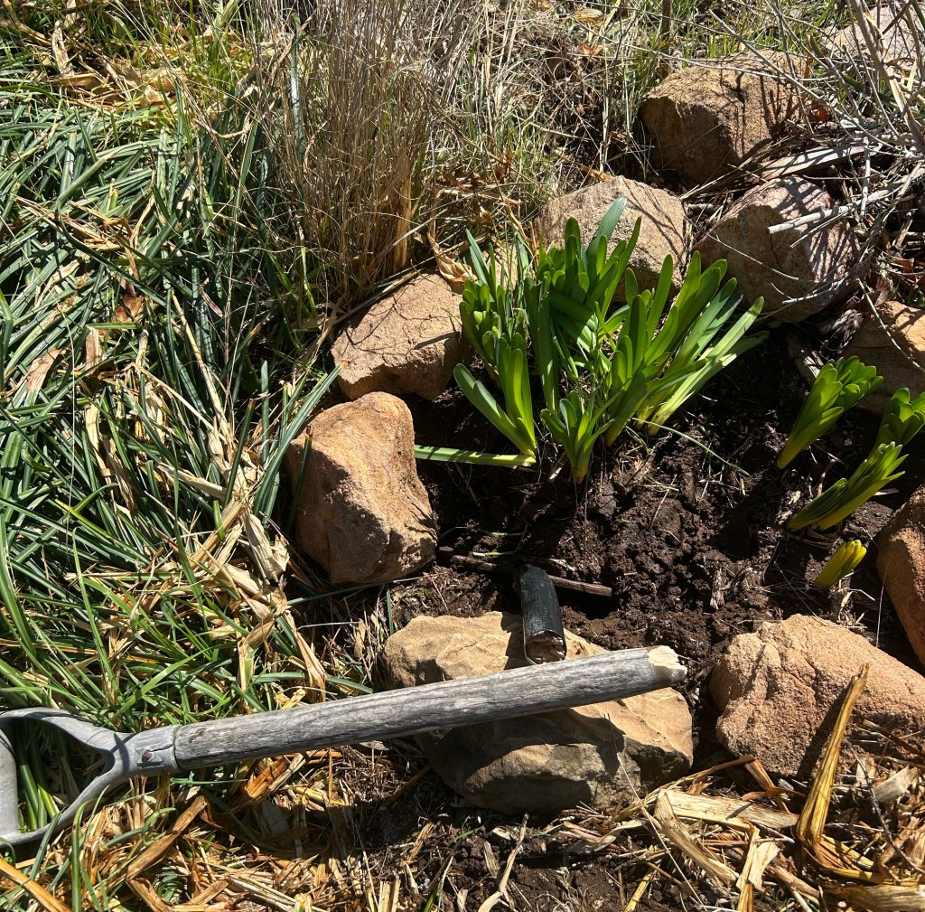 So I went back inside, lost my gloves for the third time, and grabbed the 10 or 15 gallon baskets. Those would do. I started to dig. It was a sludge pit from all the water I tried to drown the sweet gophers with. In less than 5 minutes, my pitchfork snapped. My bulb-digging pride was a bit hurt. I only break shovels on large Crinum.